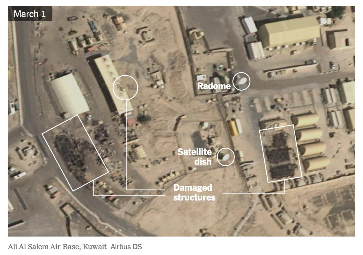 • В Кувейте - три радиолокационных купола на базе Кэмп-Арифджан были повреждены или разрушены; на авиабазе Али-эль-Салем были повреждены или разрушены по меньшей мере восемь зданий или сооружений, расположенных рядом с инфраструктурой спутниковой связи.