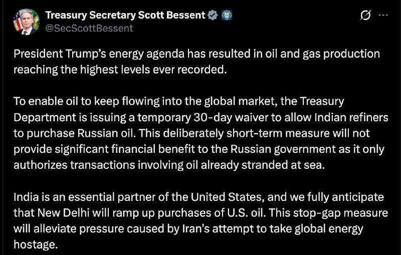 "Для обеспечения бесперебойного потока нефти на мировой рынок Министерство финансов США вводит временное 30-дневное разрешение, позволяющее индийским нефтеперерабатывающим заводам закупать российскую нефть. Эта заведомо краткосрочная мера не принесет существенной финансовой выгоды российскому правительству, поскольку она разрешает только сделки с нефтью, уже находящейся в море", - заявил глава минфина США.