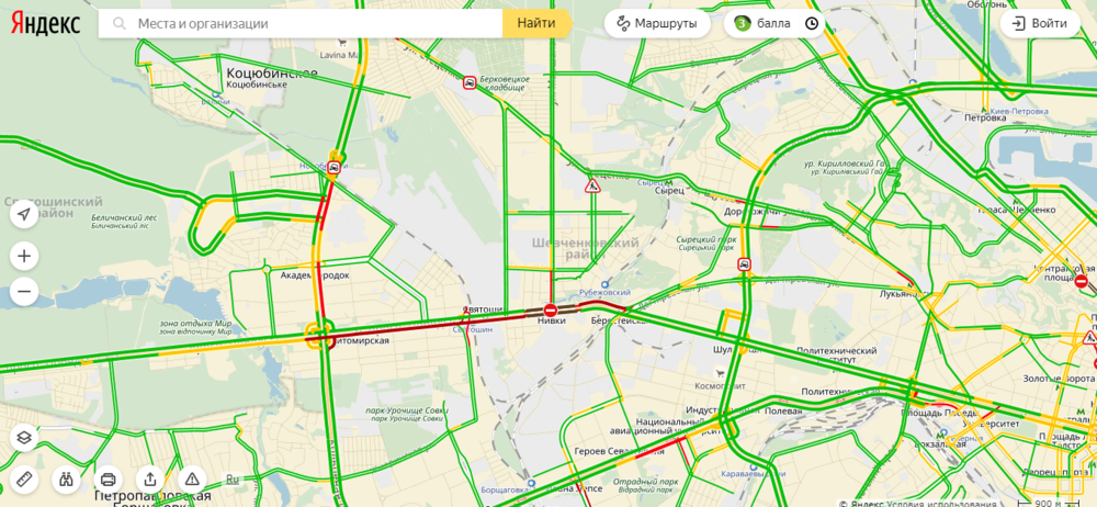 Данные на "Яндекс Пробки" показывают, что причиной затора в направлении центра города является ремонт моста Нивки, из-за чего на трассе введены ограничения движения.