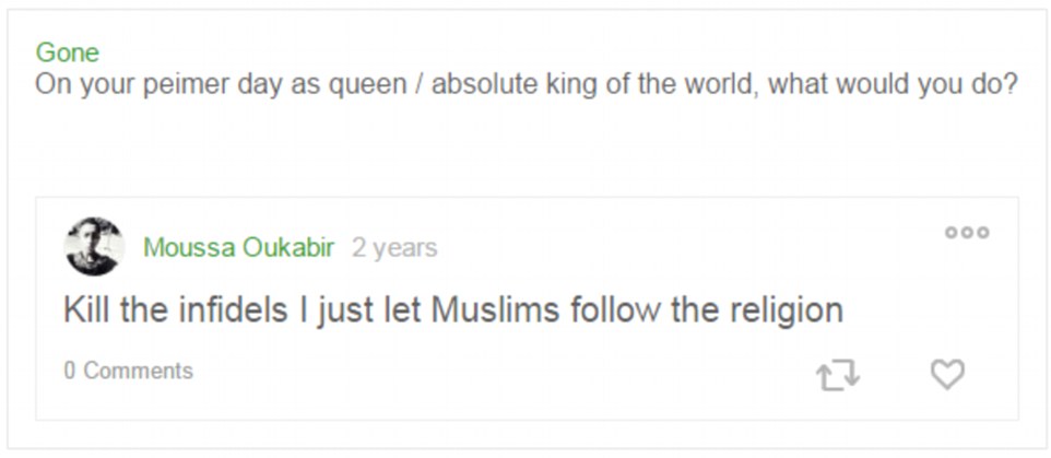 Ранее Мусса писал об убийствах в интернете. Он написал в социальной сети Киви, что, если бы он был королем мира, его первым действием было бы "убить неверных". На вопрос, где он не может жить, он ответил: "Ватикан".