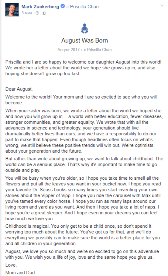 "Присцилла и я так счастливы приветствовать нашу дочь Август в этом мире. Мы написали ей письмо о мире, в котором, надеемся, ей предстоит взрослеть, но также надеемся, что взрослеть не слишком быстро", пишет счастливый отец.