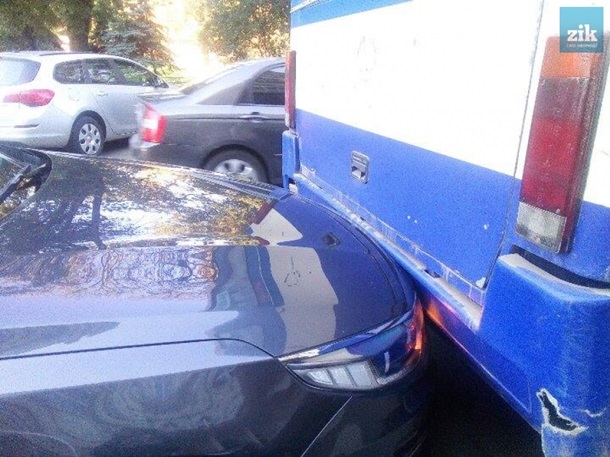 Автобус задним ходом столкнулся со служебным автомобилем KIA Optima председателя Львовского областного совета Александра Ганущина.