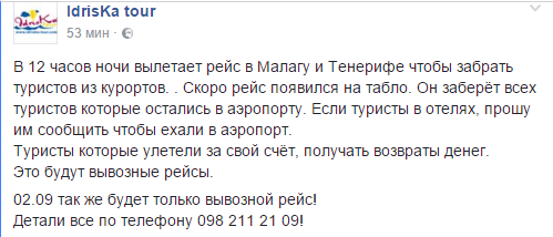 "Скоро рейс появится на табло. Он заберёт всех туристов, которые остались в аэропорту. Если туристы в отелях, прошу им сообщить чтобы ехали в аэропорт. Туристы которые улетели за свой счёт, получать возвраты денег. Это будут вывозные рейсы. 02.09 так же будет только вывозной рейс! Детали все по телефону 098 211 21 09", - говорится в сообщении.