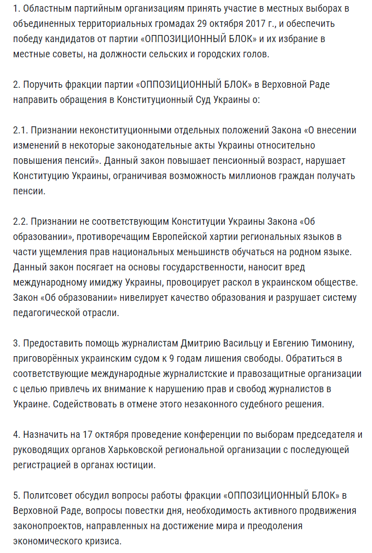Политсовет партии "Оппозиционный блок" поручил фракции партии "Оппозиционный блок" в Верховной Раде направить обращения в Конституционный Суд Украины о признании неконституционными отдельных положений пенсионной реформы и реформы образования. Об этом говорится на официальном сайте партии.