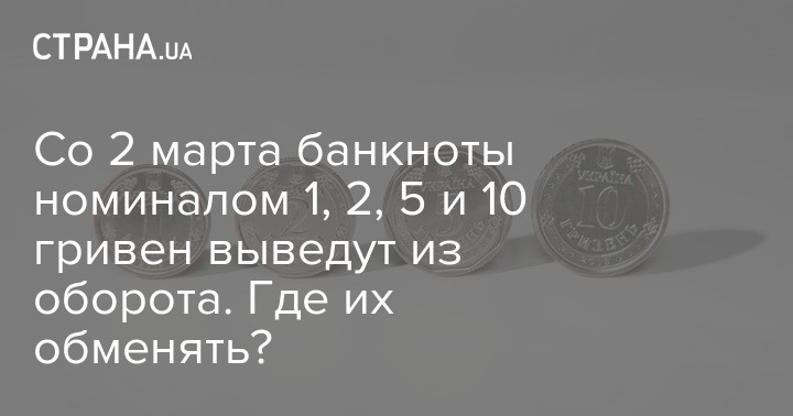 Нацбанк заявив про виведення з 2 березня з грошового обігу України чотирьох дрібних банкнот номіналом 1,2,5 та 10 гривень. З цієї дати вони перестануть бути засобами платежу та будуть вилучені з грошового обігу, тобто їх перестануть приймати у магазинах та на ринках, а також банківські установи та небанківські платіжні організації для поповнення рахунку та переказів.
