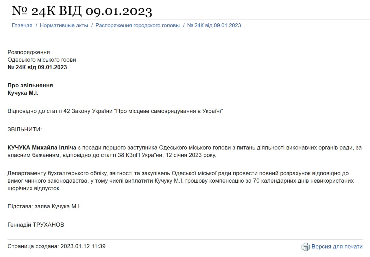Один із фігурантів "одеської справи" - перший заступник мера міста Михайло Кучук, який фігурує в новій "одеській справі" про корупцію місцевої влади і перебуває зараз в Австрії - звільнений з посади. Розпорядження про це вийшло на сайті мерії.