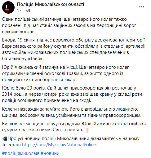 "Колеги назавжди запам'ятають його відповідальною людиною, щирою, доброзичливою, усміхненою та гідною правоохоронцем. Висловлюємо щирі співчуття рідним Юрія Хижинського і глибоко сумуємо разом з ними. Світла пам'ять", - додає прес-служба.
