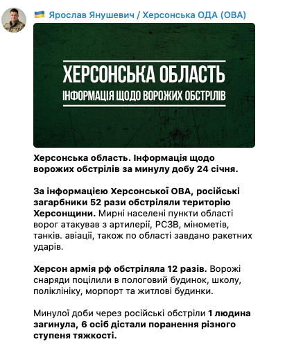 Росія 52 рази обстріляла Херсонську область за минулу добу. Одна людина загинула, шестеро отримали поранення.