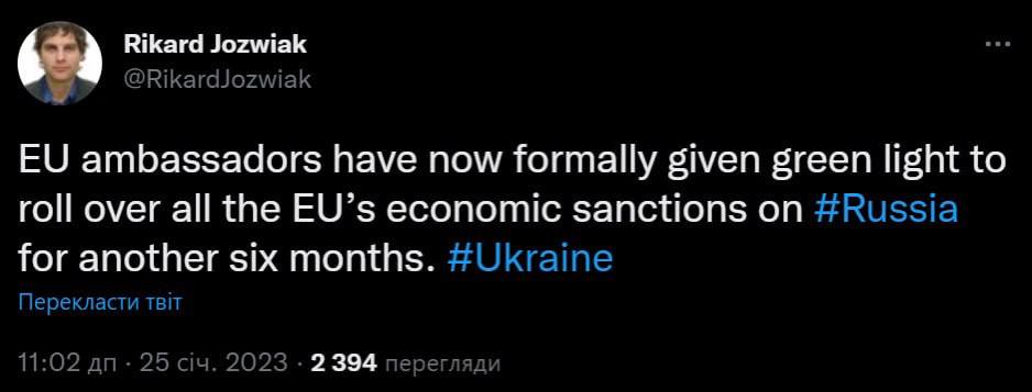 "Посли ЄС офіційно дали "зелене світло" для продовження всіх економічних санкцій Євросоюзу проти Росії ще на шість місяців", - написав журналіст.