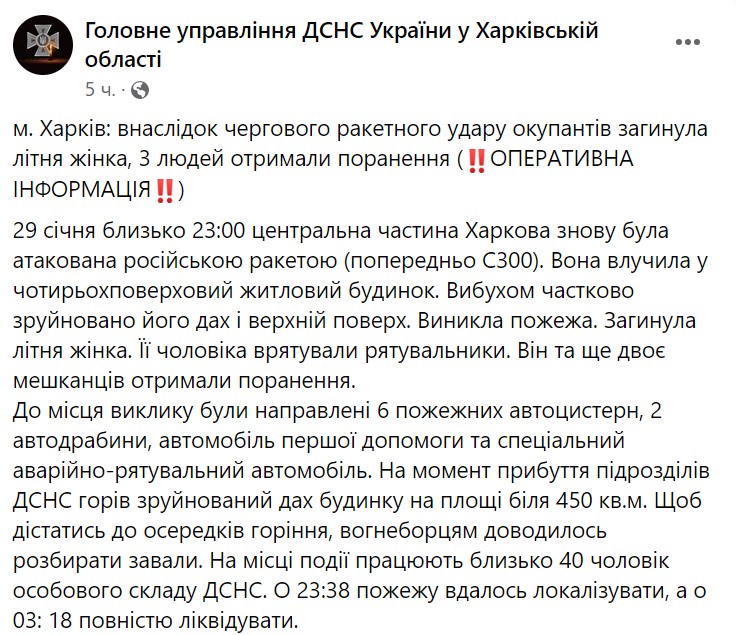 Нагадаємо, ракета вдарила по житловому будинку у Харкові пізно недільного вечора, 29 січня. Синегубов заявив, що обстріл здійснювався ракетами комплексу С-300.