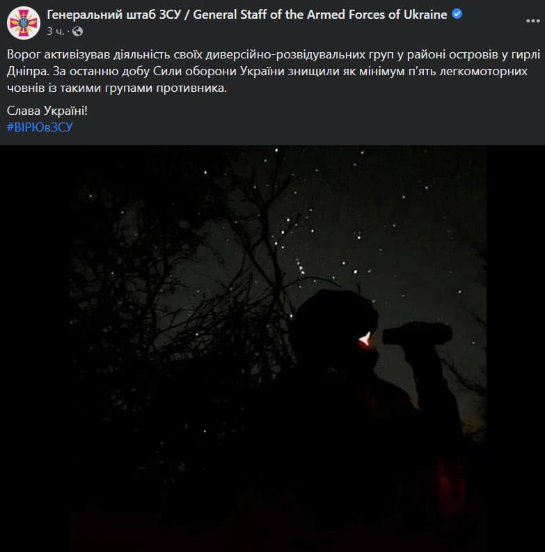 Генштаб ЗСУ повідомив, що українські військові за добу знищили щонайменше п'ять легкомоторних човнів із диверсійно-розвідувальними групами РФ у районі островів у гирлі Дніпра.