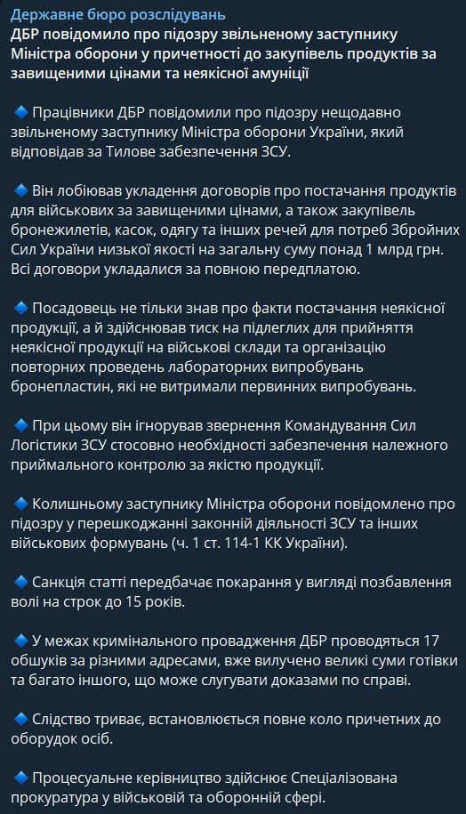 "Він лобіював укладання договорів про постачання продуктів для військових за завищеними цінами, а також закупівель бронежилетів, касок, одягу та інших речей для потреб Збройних Сил України низької якості на загальну суму понад 1 млрд грн. Усі договори укладалися за повною передплатою", - заявили у ДБР.
