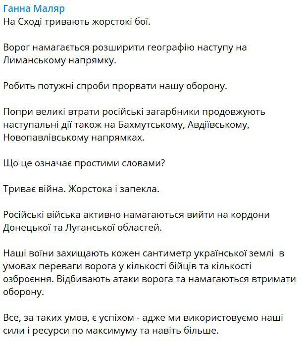 "Йде війна. Жорстока та запекла. Російські війська активно намагаються вийти на кордони Донецької та Луганської областей. Наші воїни захищають кожен сантиметр української землі в умовах переваги ворога у кількості бійців та озброєнні. Відбивають атаки ворога та намагаються утримати оборону", - написала Маляр.