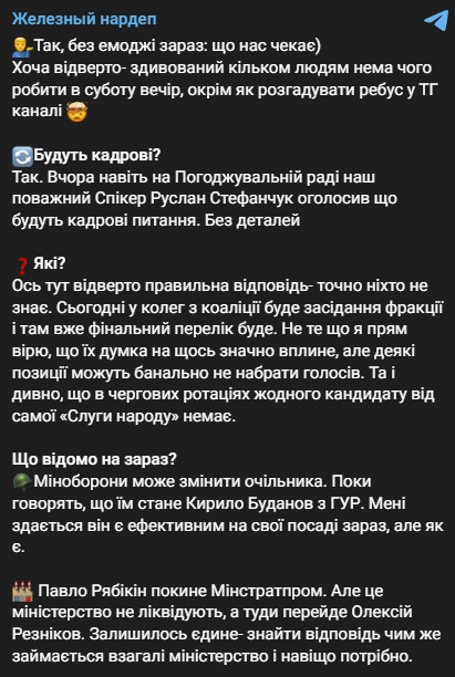 Народний депутат Ярослав Железняк анонсував низку кадрових змін у владі.