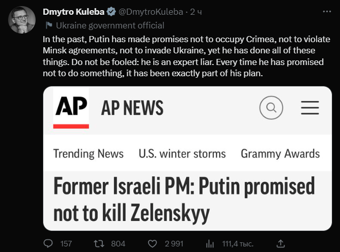 "У минулому Путін давав обіцянки не окупувати Крим, не порушувати Мінські угоди, не вторгатися в Україну, але все це він зробив. Не дайте себе обдурити: він майстерний брехун. Щоразу, коли він обіцяв чогось не робити, це було частиною його плану", - написав Кулеба у Твіттері.