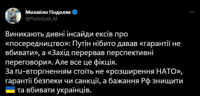 "Виникають дивні інсайди ексів про "посередництво": Путін нібито давав "гарантії не вбивати", а "Захід перервав перспективні переговори". Але все це фікція. За російським вторгненням стоїть не "розширення НАТО", гарантії безпеки чи санкції, а бажання Росії знищити Україну та вбивати українців", - заявив Подоляк.