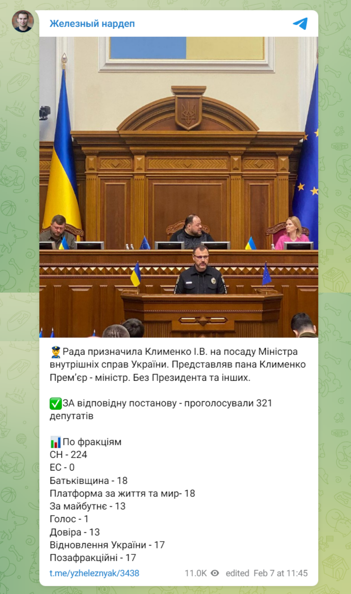 Нагадаємо, що 6 лютого прем'єр-міністр України Денис Шмигаль подав до Ради подання про призначення Клименка міністром внутрішніх справ.
