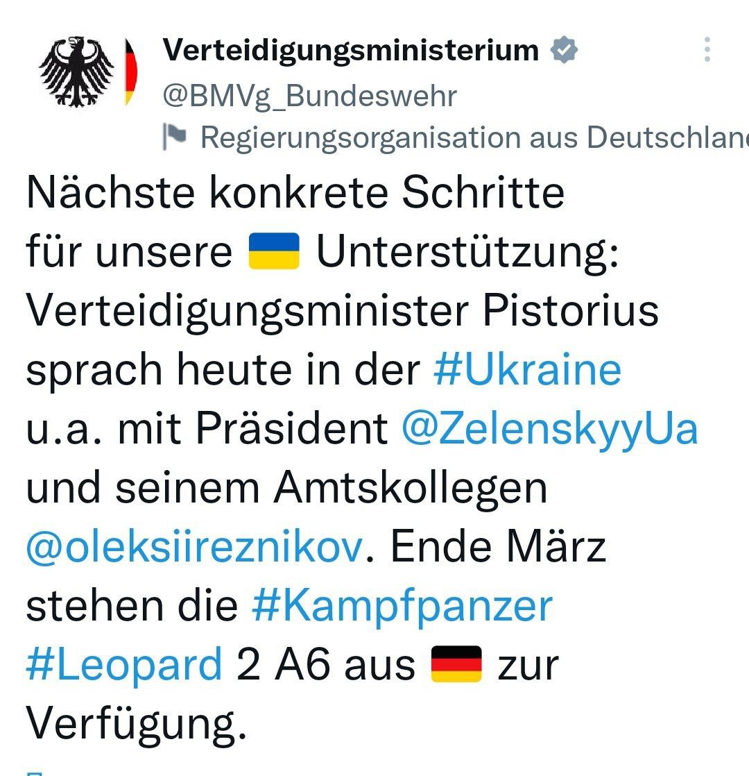Німецький Бундесвер повідомляє, що перші танки Leopard 2 прибудуть до України наприкінці березня.