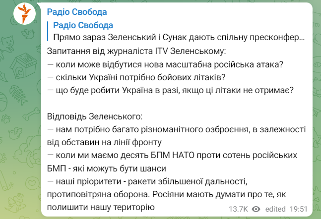 Про це заявив президент Володимир Зеленський у Великій Британії, відповідаючи на запитання журналіста ITV, повідомляє "Радіо. Свобода".