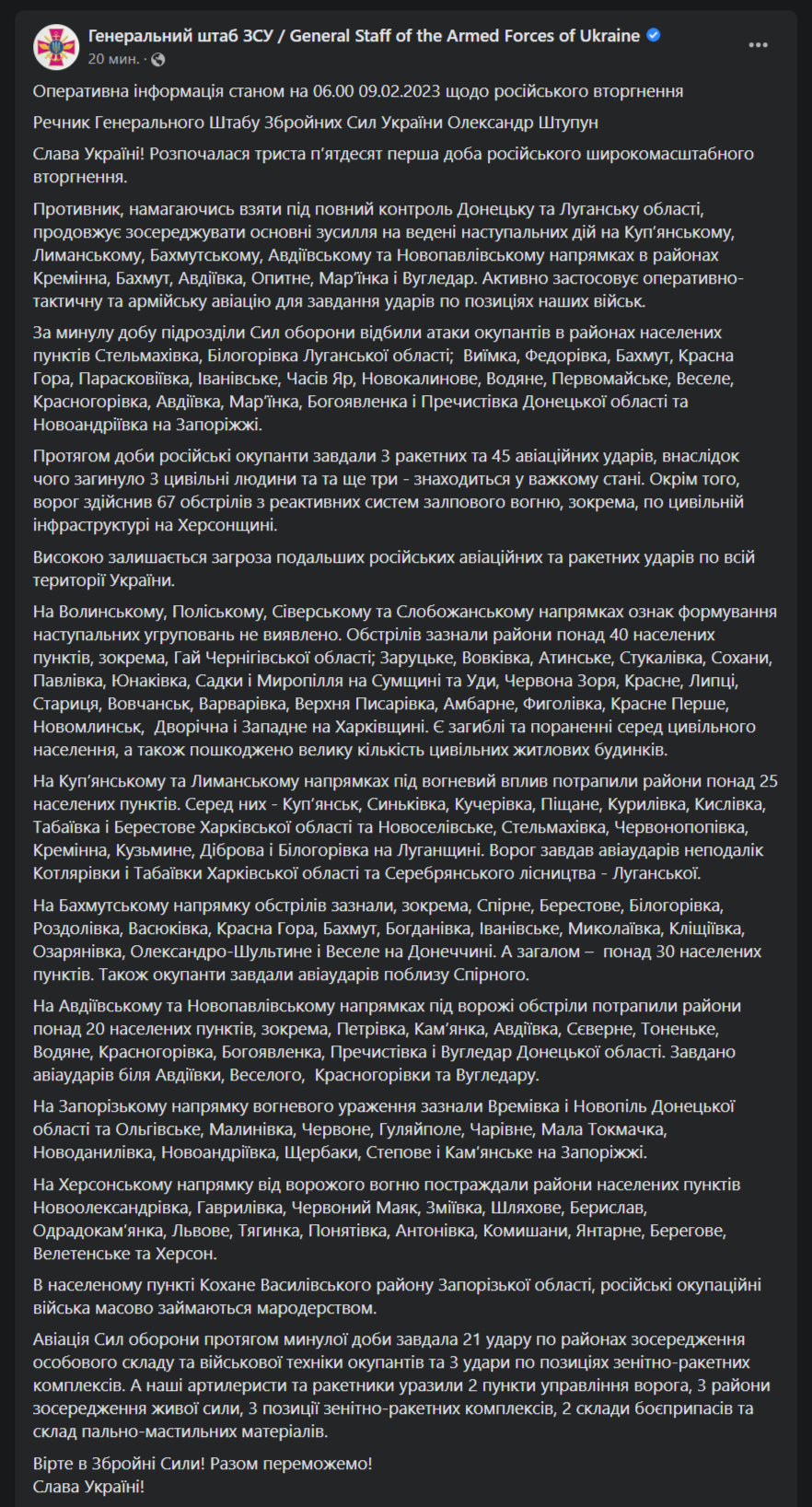 Вранці у четвер, 9 лютого, Генштаб ЗСУ опублікував актуальне зведення про те, що відбувається на фронті. Повідомляється, що росіяни продовжують наступати на Куп'янському, Лиманському, Бахмутському, Авдіївському та Новопавлівському напрямках.