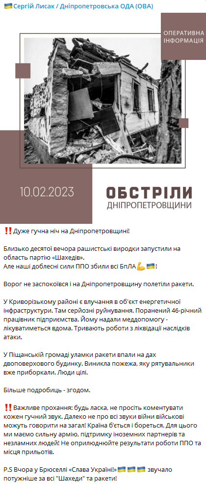 Нагадаємо, 9 лютого вночі росіяни вдарили по Дніпропетровській області,постраждали житлові будинки, є загиблий.