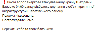"Вночі ворог вкотре атакував нашу країну "Шахидами". Близько 04:00 ранку сталося потрапляння в об'єкт критичної інфраструктури Шепетівського району".