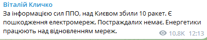 "Є пошкодження електромереж. Постраждалих немає. Енергетики працюють над відновленням мереж", - додав Кличко.
