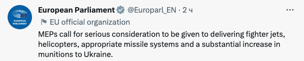 Також Європарламент закликає країни ЄС серйозно розглянути надання Україні винищувачів, вертольотів, необхідних ракетних систем та суттєво збільшити постачання боєприпасів.