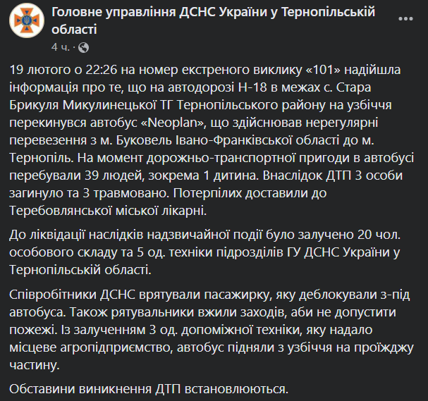 На момент аварії в автобусі перебувало 39 осіб, серед яких одна дитина. Внаслідок ДТП загинули троє людей, ще троє отримали поранення. Травмованих доправили до Теребовлянської міської лікарні.