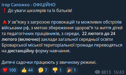 "У зв'язку з загрозою провокацій та можливих обстрілів військами Росії, з метою збереження здоров'я та життя дітей та педагогічних працівників, з середи, 22 лютого по 24 лютого (включно) заклади загальної середньої освіти Броварської міської територіальної громади переводяться на дистанційну форму навчання. Дитячі садки працюють у звичайному режимі", - йдеться у повідомленні.