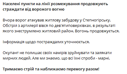 "Інформація про постраждалих уточнюється. Окупант не залишає своїх намірів зруйнувати та залякати мирних людей. Але ми знаємо, що всі їхні спроби – марні", - йдеться у повідомленні.