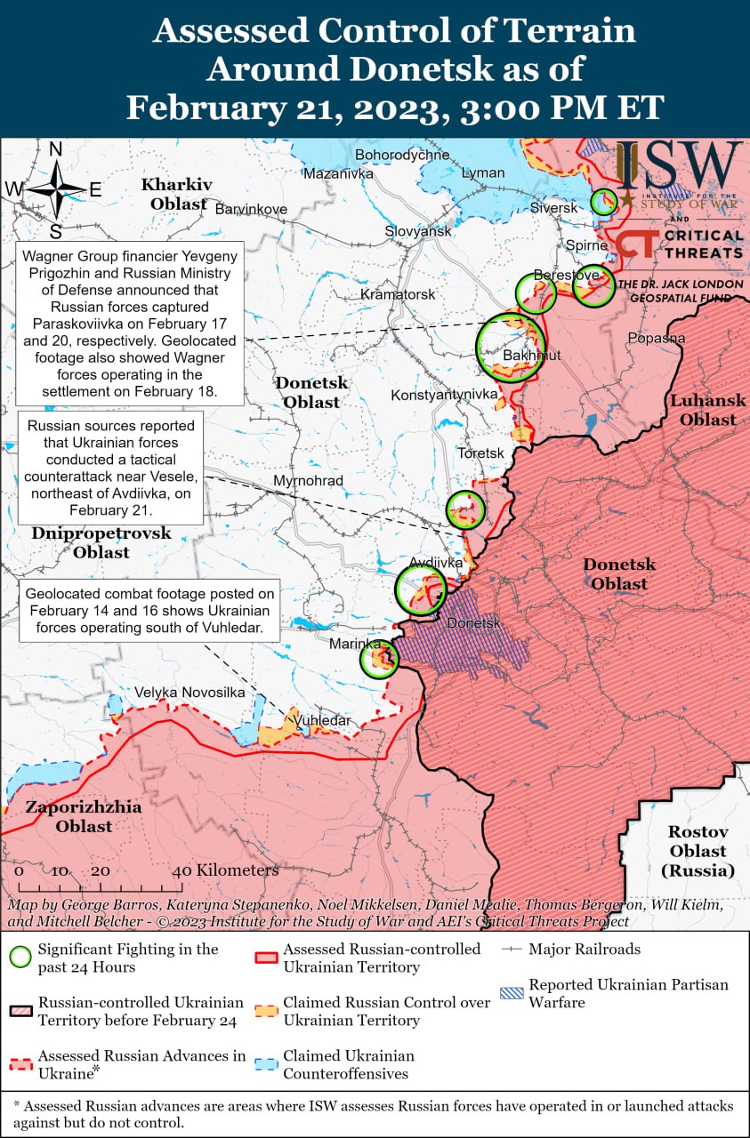 "На кадрах з геолокацією, знятих 14 лютого і опублікованих 20 лютого, видно, як українські танки ведуть вогонь російською піхотою в смузі дерев уздовж траси Е40 Бахмут-Слов'янськ, що підтверджує, що російським силам вдалося перерізати дорогу Е40 на північний захід ", - йдеться у зведенні.