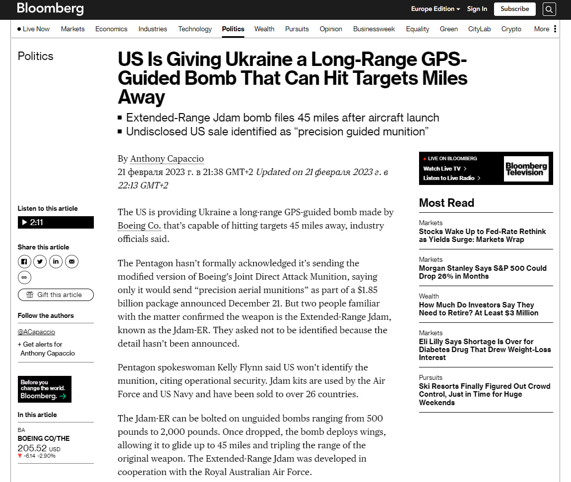 США постачають Україні модифікований боєприпас виробництва Boeing Co з GPS-наведенням та радіусом ураження у 45 миль (72,4 км).