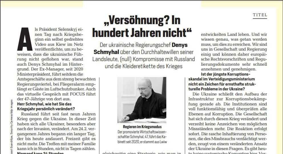 Таку думку висловив прем'єр-міністр Денис Шмигаль в інтерв'ю німецькому Focus.