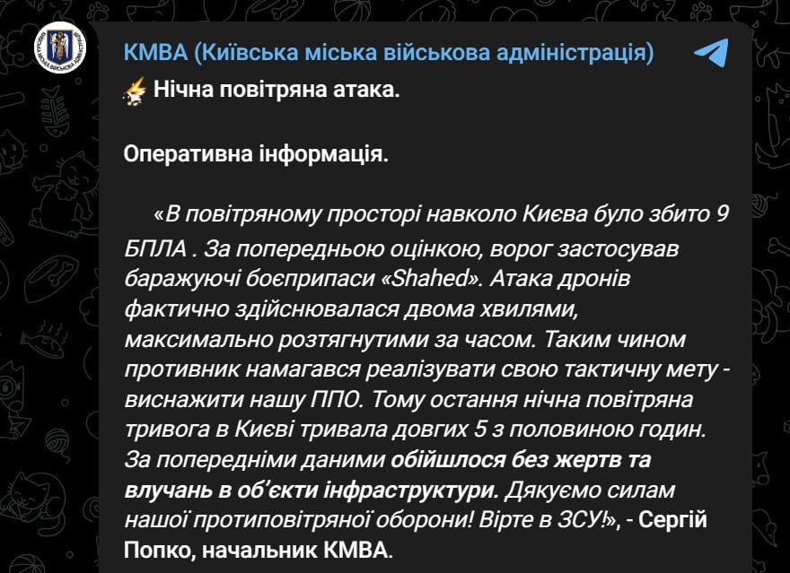 "За попередньою оцінкою, ворог застосував барражуючі боєприпаси "Shahed". Атака дронів фактично здійснювалася двома хвилями, максимально розтягнутими за часом. Таким чином противник намагався реалізувати свою тактичну мету – виснажити нашу ППО. Тому остання нічна повітряна тривога у Києві тривала п'ять з половиною годин. ", - розповів Попко.