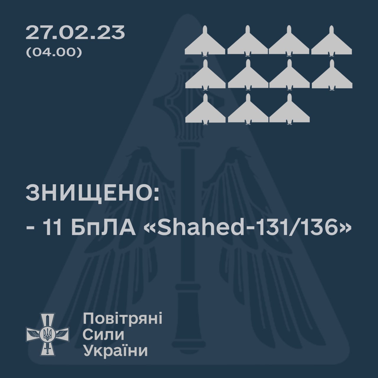 За ніч Україною було випущено до 14 дронів-камікадзе, одинадцять з яких було знищено.