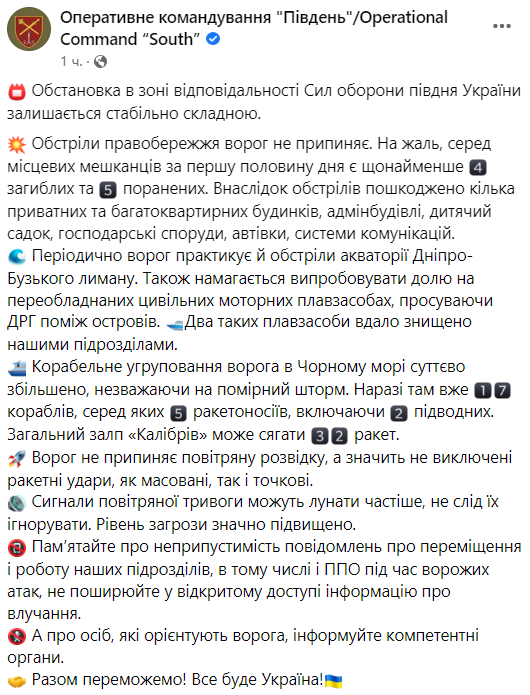 Про це повідомляє Оперативне командування "Південь" у Facebook.