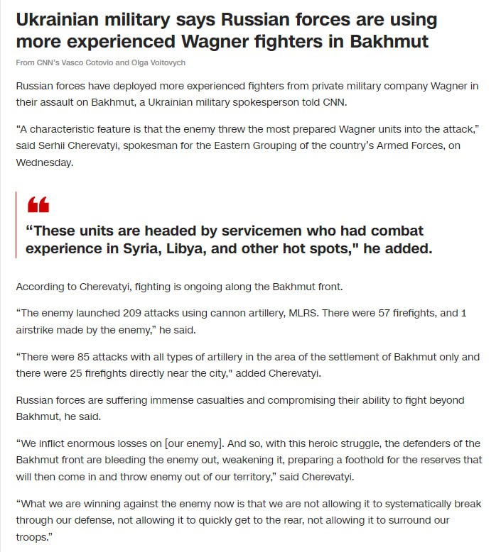За словами Череватого, РФ використовує в Бахмуті досвідчених "вагнерівців" з досвідом боїв у Сирії, Лівії, та інших гарячих точках, але ЗСУ тримають позиції, не даючи противнику оточити місто.