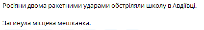 "Росіяни двома ракетними ударами обстріляли школу в Авдіївці. Загинула місцева мешканка", - повідомив він.