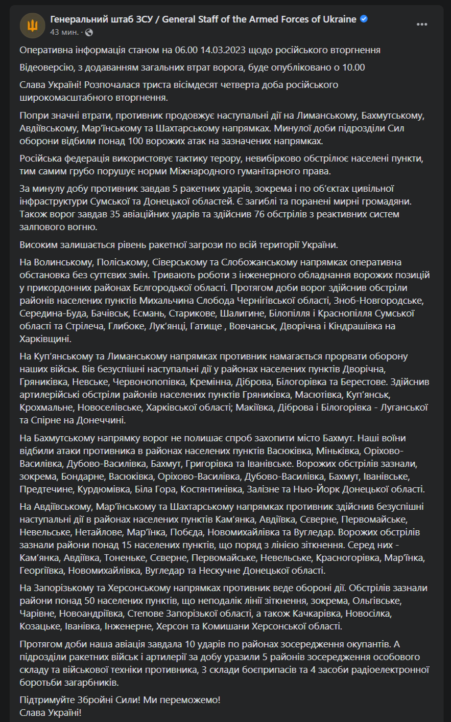 Вранці у вівторок, 14 березня, Генштаб ЗСУ опублікував актуальне зведення з фронту. Повідомляється, що за добу українські воїни відбили понад 100 ворожих атак.