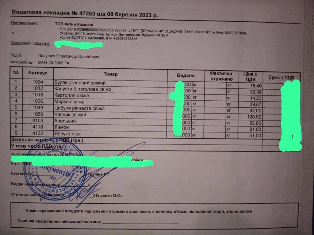 Журналіст Тетяна Ніколаєнко публікує надіслану військовими фотографію накладної, згідно з якою одна з військових частин одержує яблука по 51 грн/кг. Хоча у супермаркетах вони коштують удвічі дешевше.