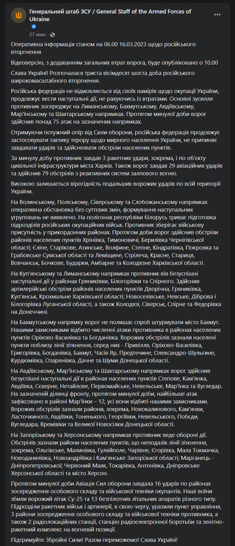 Вранці у четвер, 16 березня, Генштаб ЗСУ опублікував актуальне зведення з фронту. Повідомляється, що минулої доби росіяни здійснили понад 75 атак.