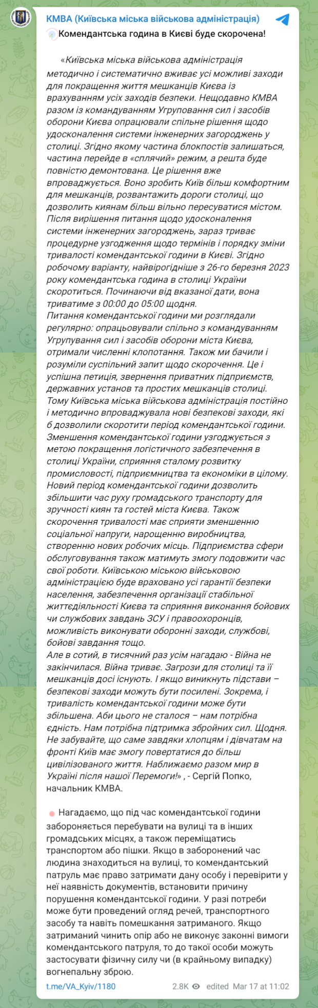 У Києві скоротять комендантську годину. З 26 березня вона триватиме з півночі до 5 ранку.