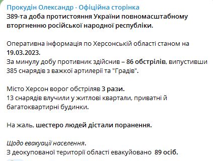 Щодо евакуації населення, то з деокупованої території Херсонської області евакуйовано 89 осіб.