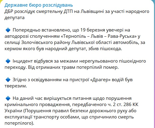 Також говориться, що нардеп, який скоїв наїзд на пішохода, за даними експрес-тесту, був тверезий.