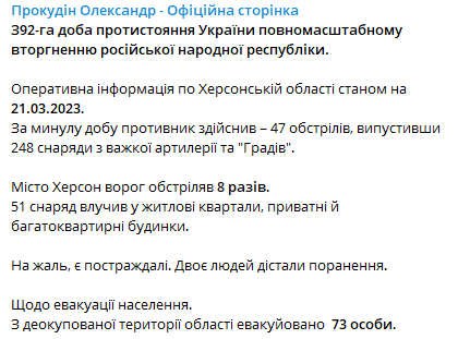 Нагадаємо, що 19 березня російські війська за добу 53 рази обстріляли Херсон і область, двоє людей отримали поранення.