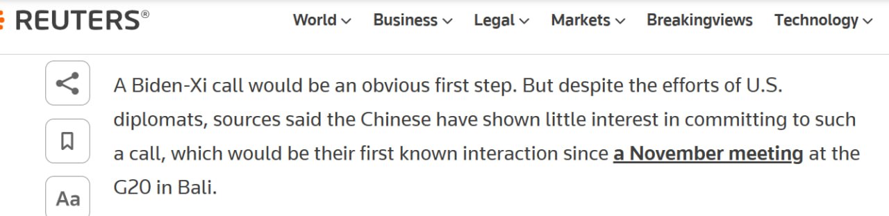 "Дзвінок Байден-Сі був би очевидним першим кроком. Але, незважаючи на зусилля американських дипломатів, джерела повідомили, що китайці не виявили особливого інтересу до такого заклику", - каже джерело агентства Reuters.