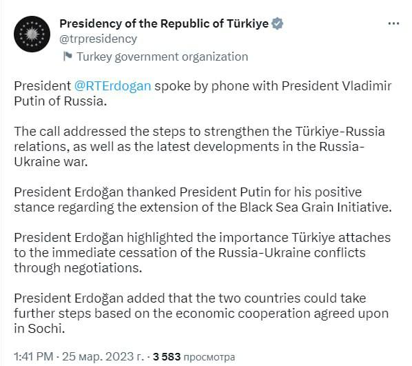 А ось як інформує про бесіду твіттер офісу Ердогана: "У телефонній розмові йшлося про кроки щодо зміцнення турецько-російських відносин, а також про останні події у російсько-українській війні. Президент Ердоган подякував президенту Путіну за його позитивну позицію щодо продовження Чорноморської зернової ініціативи. Президент Ердоган наголосив на важливості, яку Туреччина надає негайному припиненню російсько-українських конфліктів шляхом переговорів".