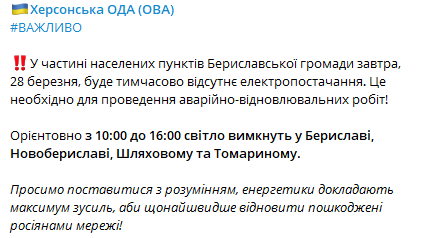 "Орієнтовно з 10:00 до 16:00 світло вимикають у Бериславі, Новобериславі, Шляховому та Томариному. Просимо поставитися з розумінням, енергетики докладають максимум зусиль, щоб якнайшвидше відновити пошкоджені росіянами мережі", - зазначають в ОВА.