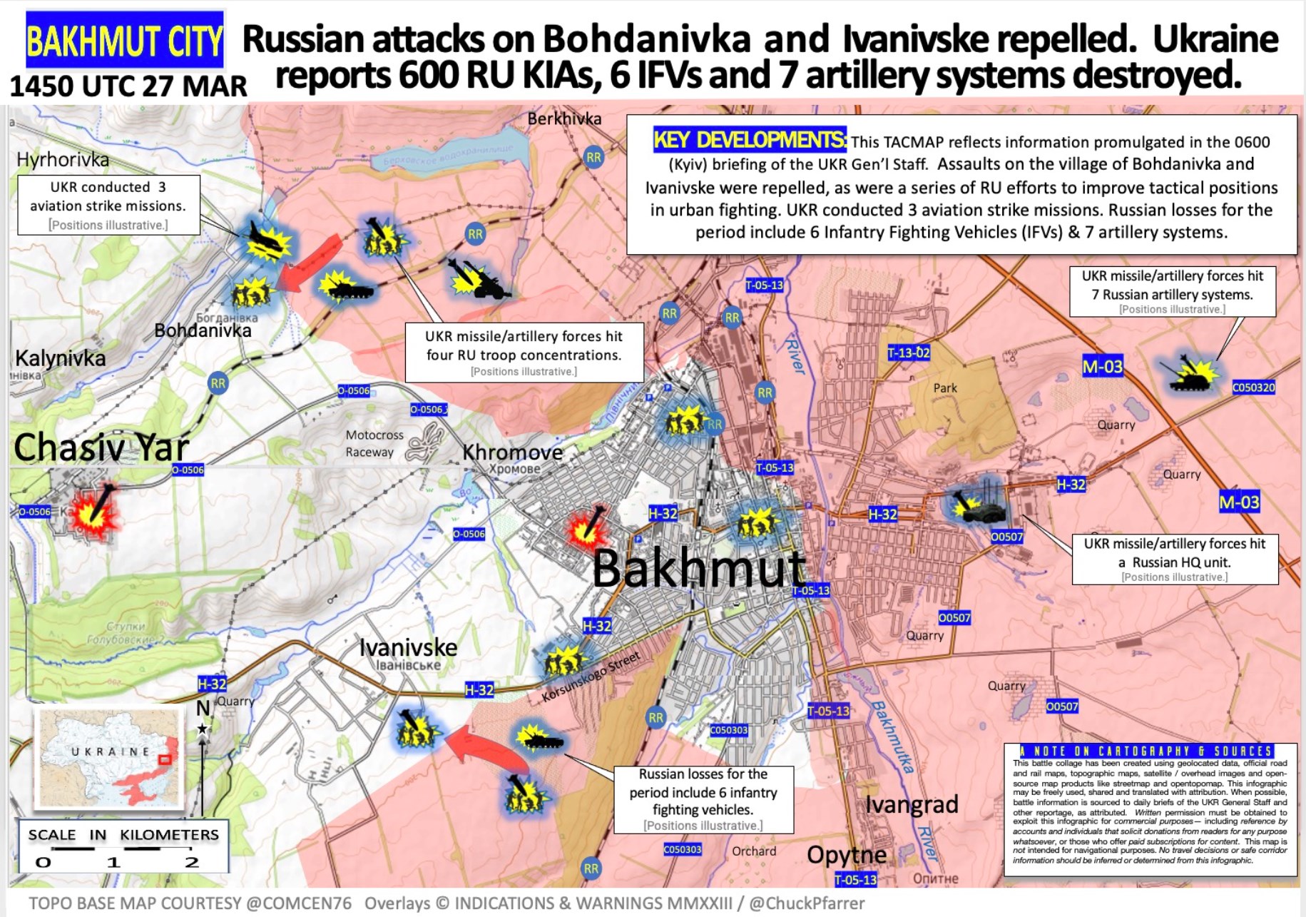 Нагадаємо, минулого тижня Сирський натякнув, що ЗСУ мають намір перейти у контрнаступ під Бахмутом. Але поки що, як бачимо, настає противник (Пригожин, втім, каже, що українські війська готуються завдати контрудару).